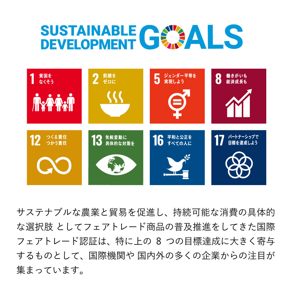 フェアトレードとは直訳すると「公平・公正な貿易」。つまり、開発途上国の原料や製品を適正な価格で継続的に購入することにより、立場の弱い開発途上国の生産者や労働者の生活改善と自立を目指す「貿易のしくみ」をいいます。また、この取り組みは社会貢献の一環として、個人だけでなく企業からも注目されています。ノベルティなどにフェアトレードの製品を使用することでサステナブル(持続可能)な社会への一歩となります。
