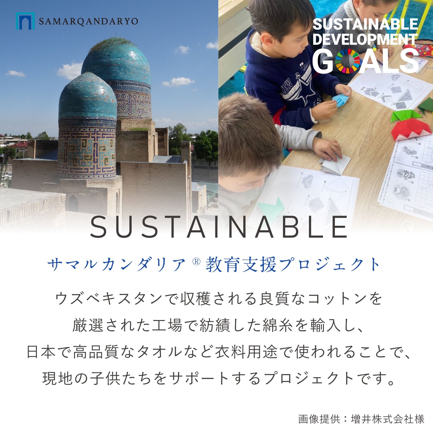ウズベキスタンで収穫される良質なコットンを厳選された工場で紡績した綿糸を輸入し、日本で高品質なタオルなど衣料用途で使われることで、現地の子供たちをサポートするプロジェクトです。