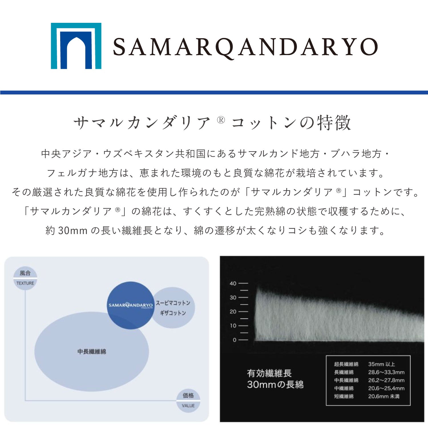 中央アジア・ウズベキスタン共和国にあるサマルカンド地方・ブハラ地方・ フェルガナ地方は、恵まれた環境のもと良質な綿花が栽培されています。 その厳選された良質な綿花を使用し作られたのが「サマルカンダリア®」コットンです。 「サマルカンダリア®」の綿花は、すくすくとした完熟綿の状態で収穫するために、 約30mmの長い繊維長となり、綿の遷移が太くなりコシも強くなります。