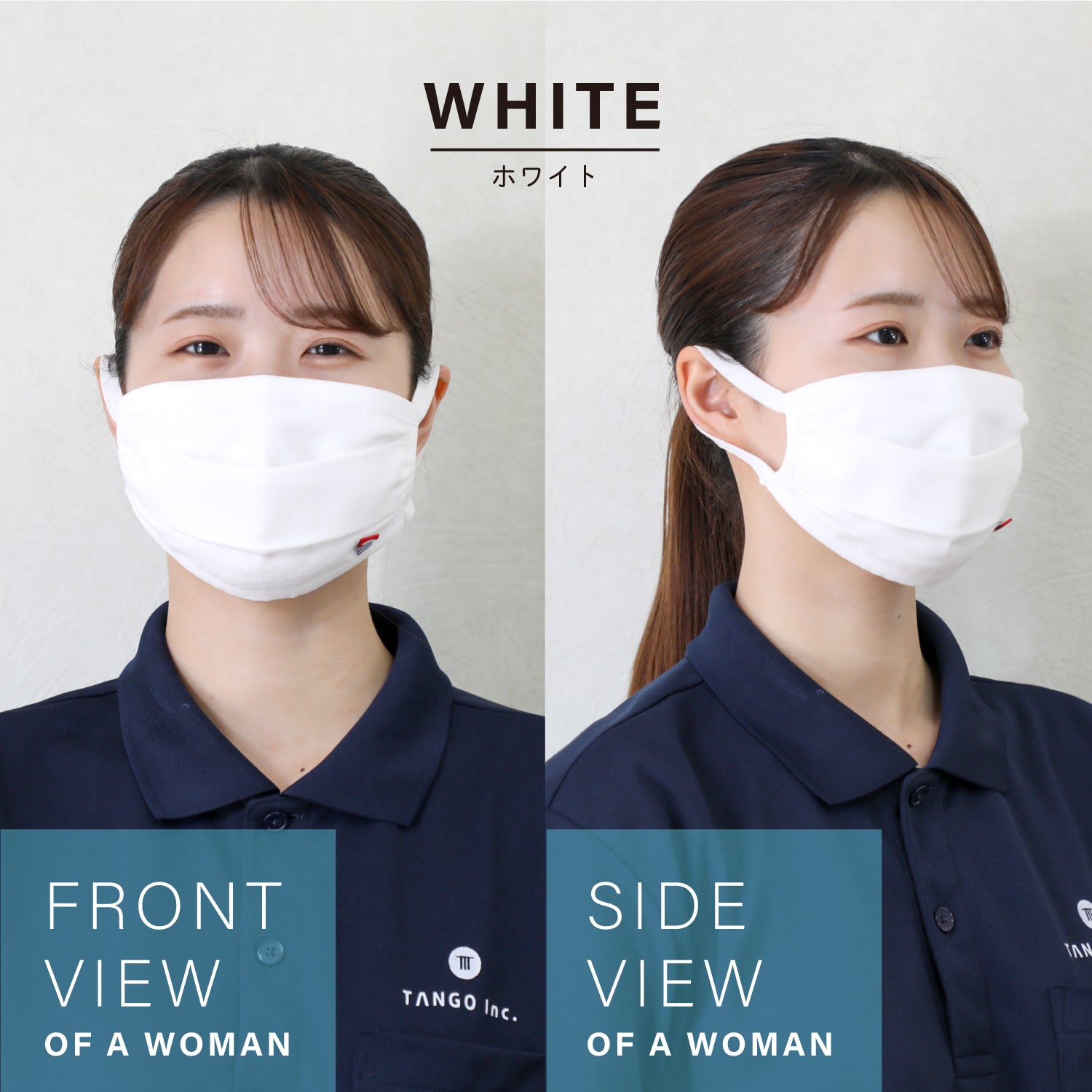 上下に広がるプリーツタイプのマスクです。カーゼ部分は顔のカーブを考慮した形状をしており、さらに伸縮性のあるテープ状の耳紐が口元にフィットして立体的に鼻から顎までを包み込みます。