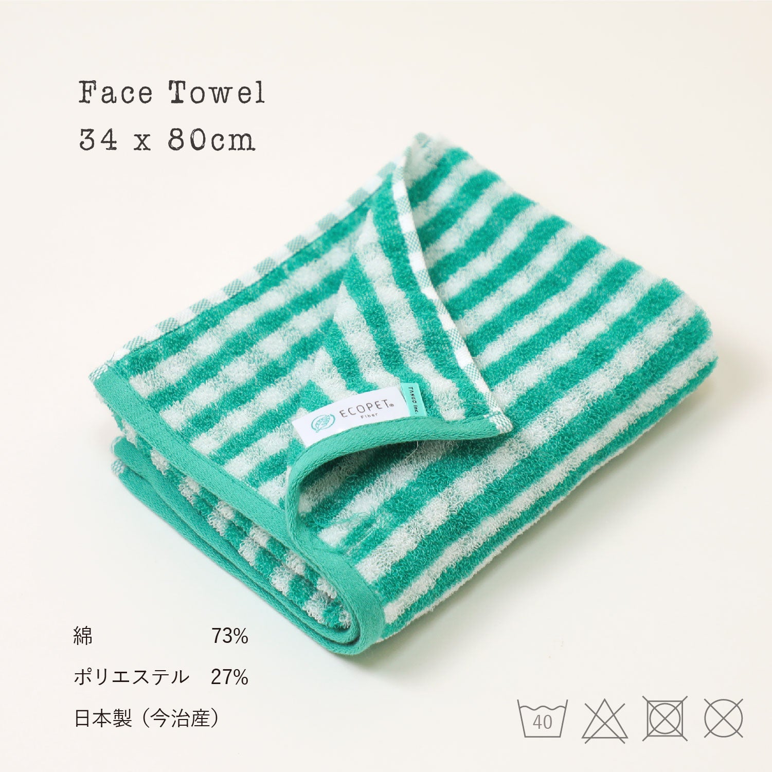 エコペット®は使用済みペットボトルや繊維くず等から再生されたリサイクルポリエステル繊維です。要らなくなったもの、捨てられたものからリサイクルされるので、廃棄物の削減と大気中に放出されるCO2の排出削減に貢献します。エコペットを使用して作られたこのタオルは、人と環境に配慮されたタオルです。