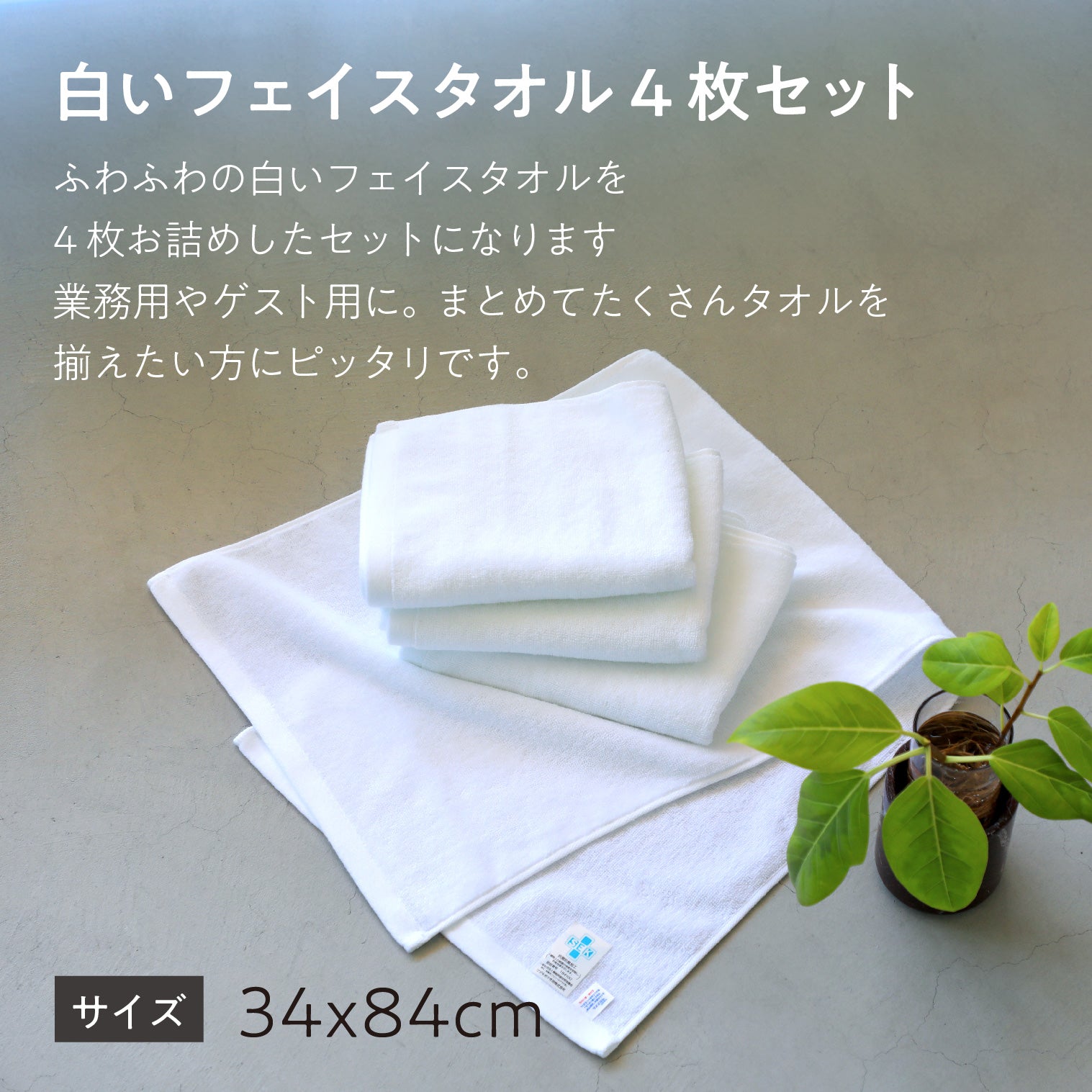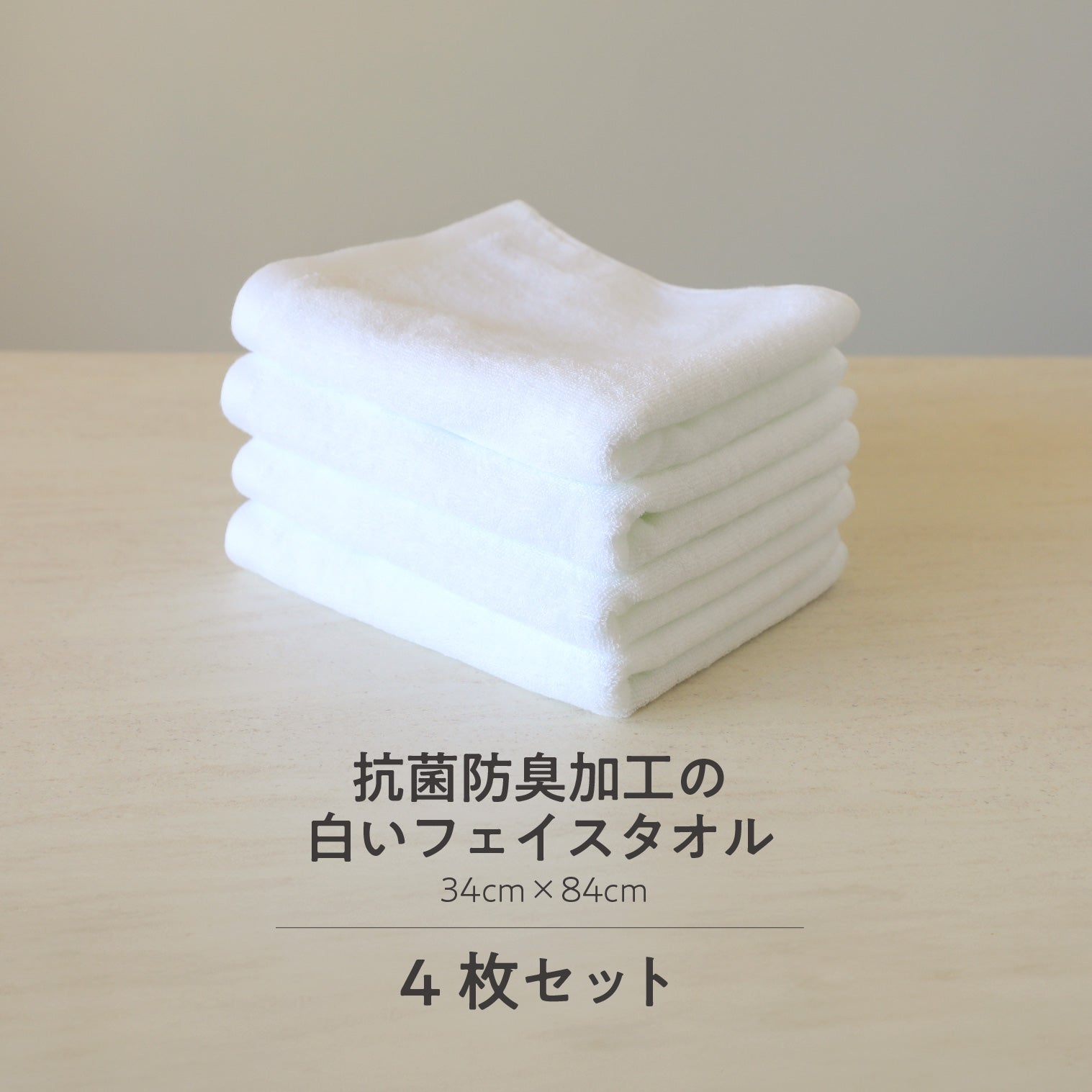 抗菌防臭加工の白いフェイスタオル〈4枚セット〉34x83cm