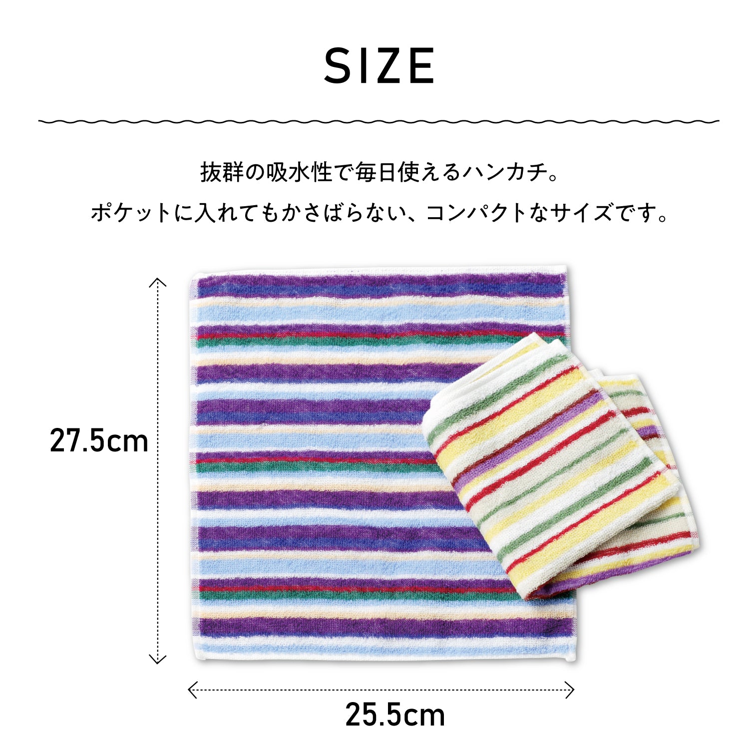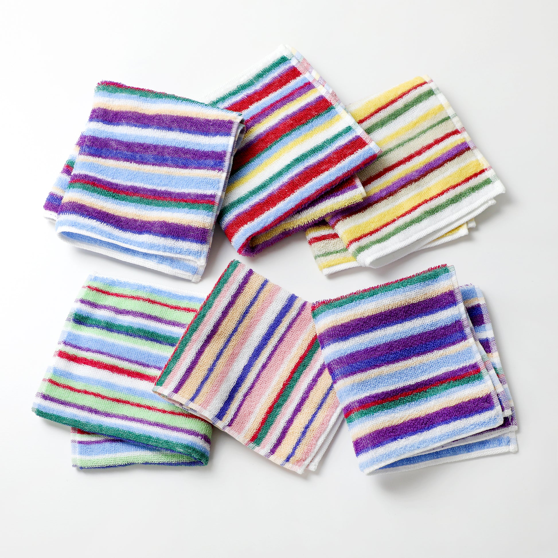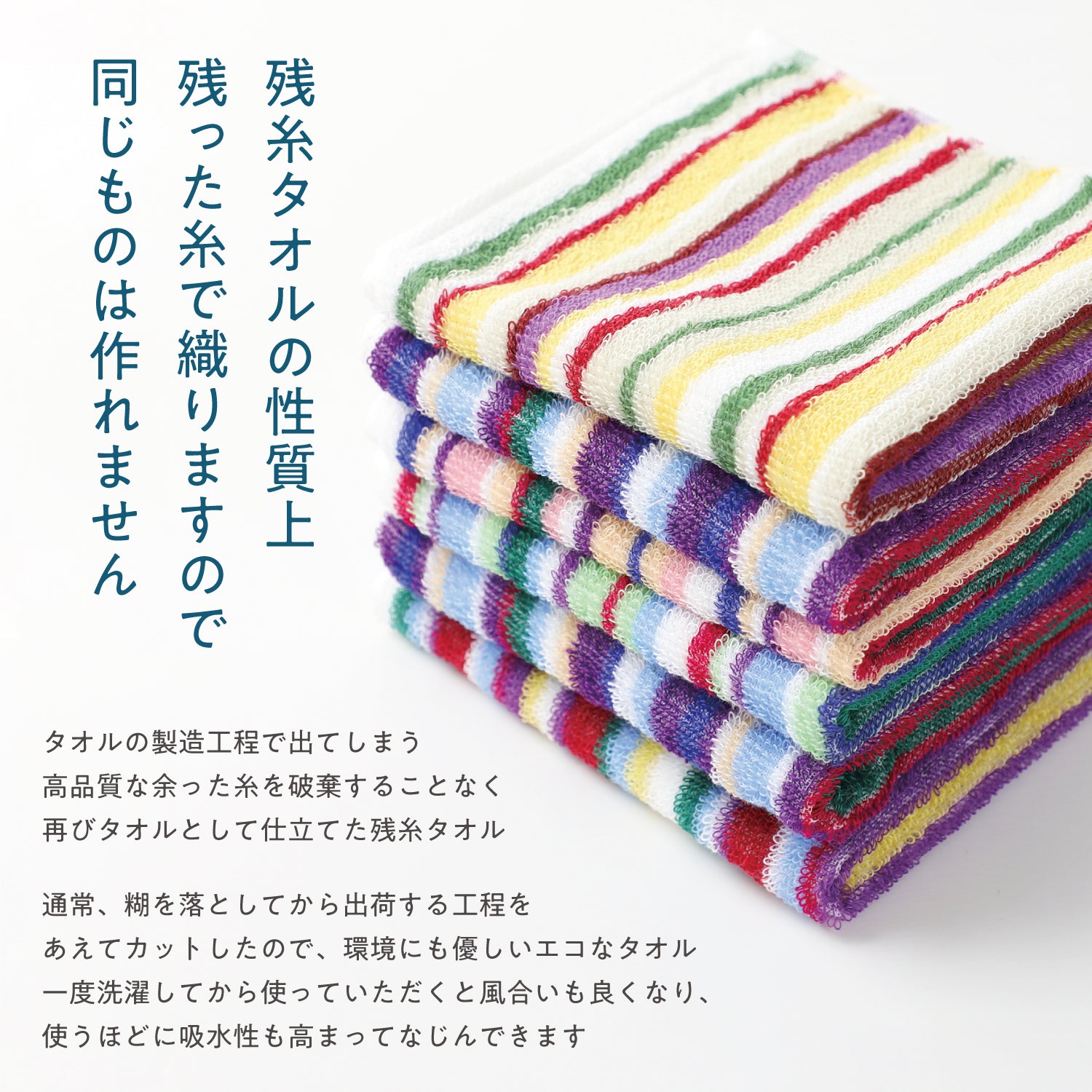 「先晒し染め」の糸 でタオルを作るとき、途中で糸が不足してまわないようにあらかじめ多めに糸を準備します。無事にタオルを織り上げると、どうしてもその染め上げた糸は残ってしまいます。これを「残糸(ざんし)」と言います。 そんな残ってしまった糸「残糸」で作られたのがこのタオルです。捨てられることなく再利用していますので環境にもよく「エコ」と言われる所以です。
